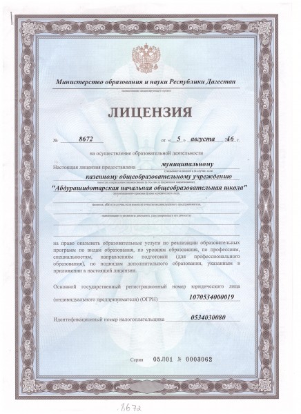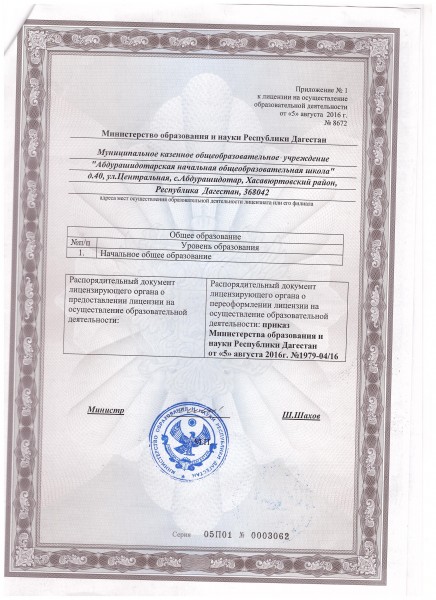 | Адрес местонахождения образовательной организации* | 368012 РД Хасавюртовский район с.Абдурашидотар |